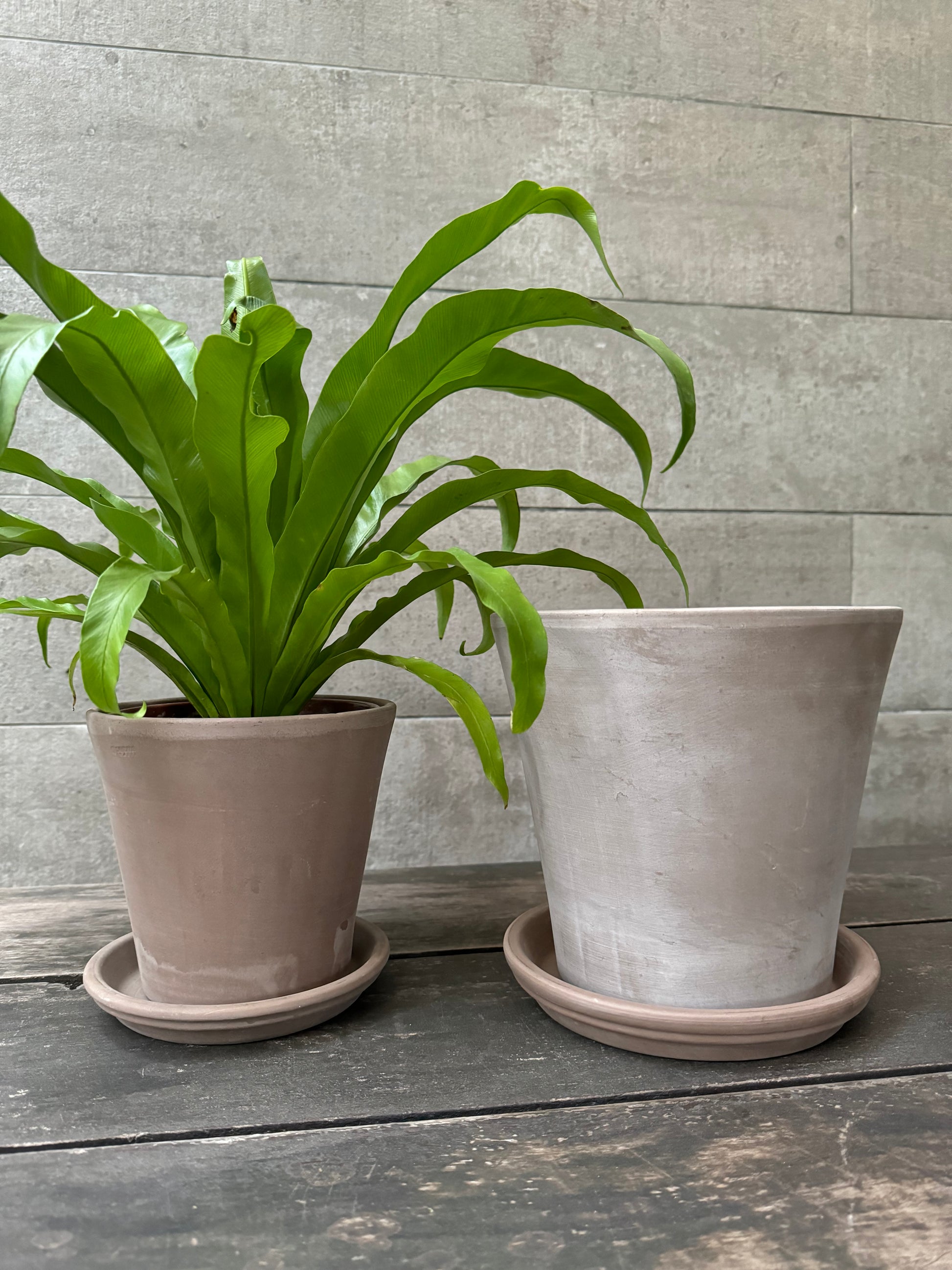 Set maceta y plato hecho de terracota. Ideal para uso interior y exterior. Tiene orificio de drenaje. Hecho en Italia. Color beige gricaseo.